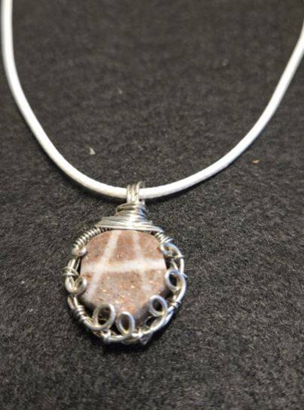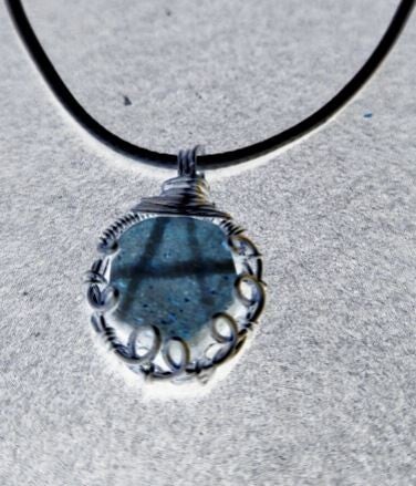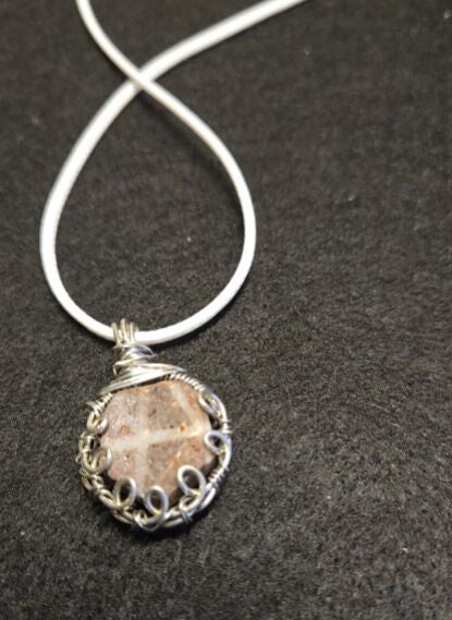 Natural pentagram, quartz limestone. polished cab. round s.s. wire wrapped , pendant. 19 inch leather necklace. about the size of a quarter.
