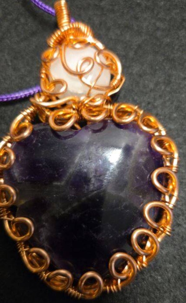 Hand shapped and polished amythest cab. perfect color. topped with a white quarts stone. copper wrapped with necklace. STUNNING!!!