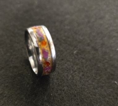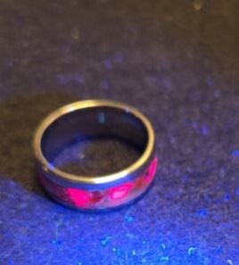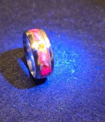 Stainless steel ring, inlay with gold base, set with natural ruby flakes that is brilliant, day or under UV light.