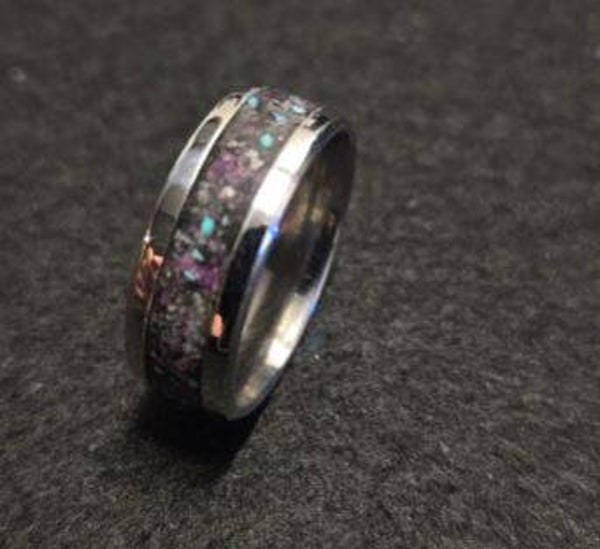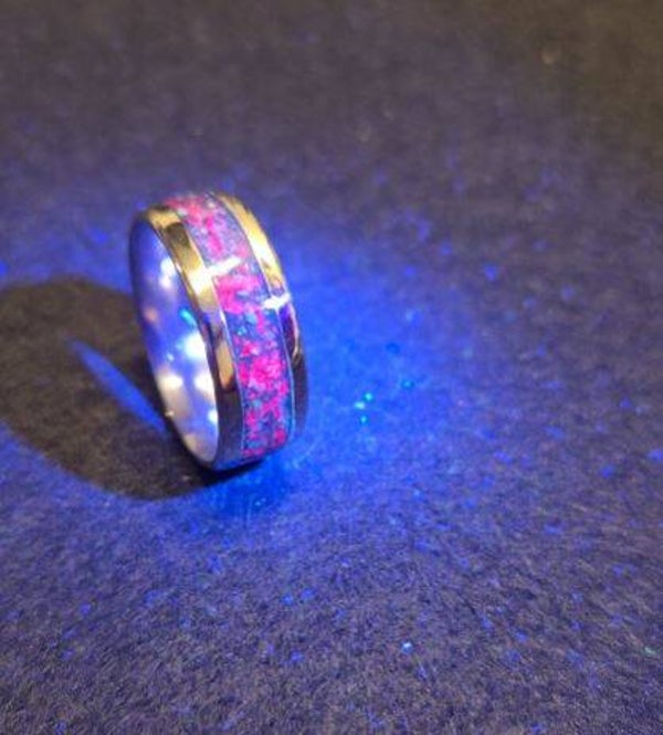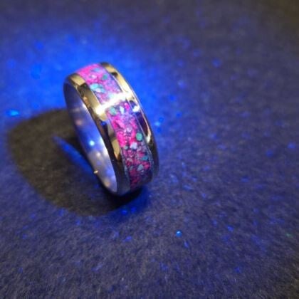 Size 10 Comfort fit Stainless steel ring. Inlay with a black base, Ruby flake and ruby dust to create the (red nebula) UV Reactive.