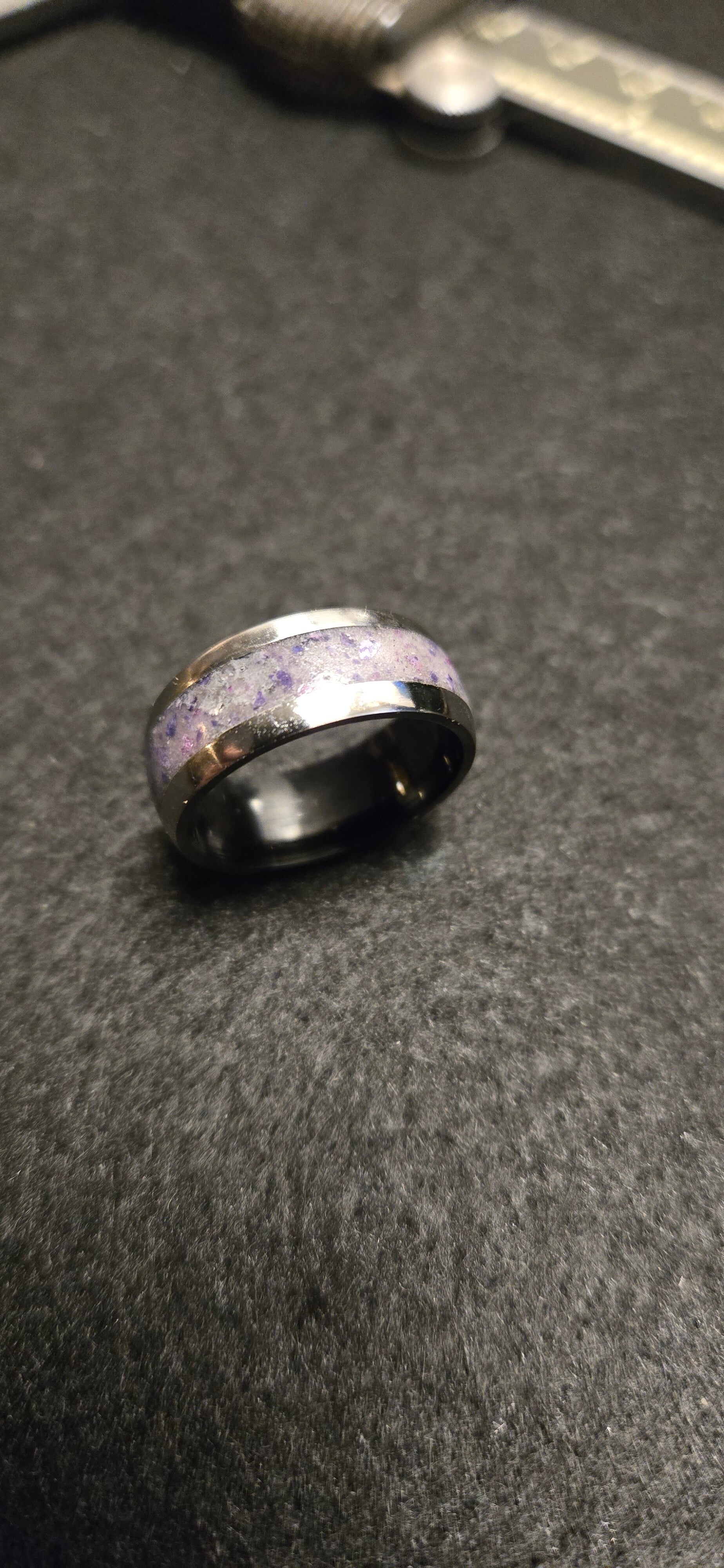 R17 Size 8. Stainless steel comfort fit unlay ring, black core. 4 opals , and a mix of fluorite, ruby flake and glow stone. UV reactive.