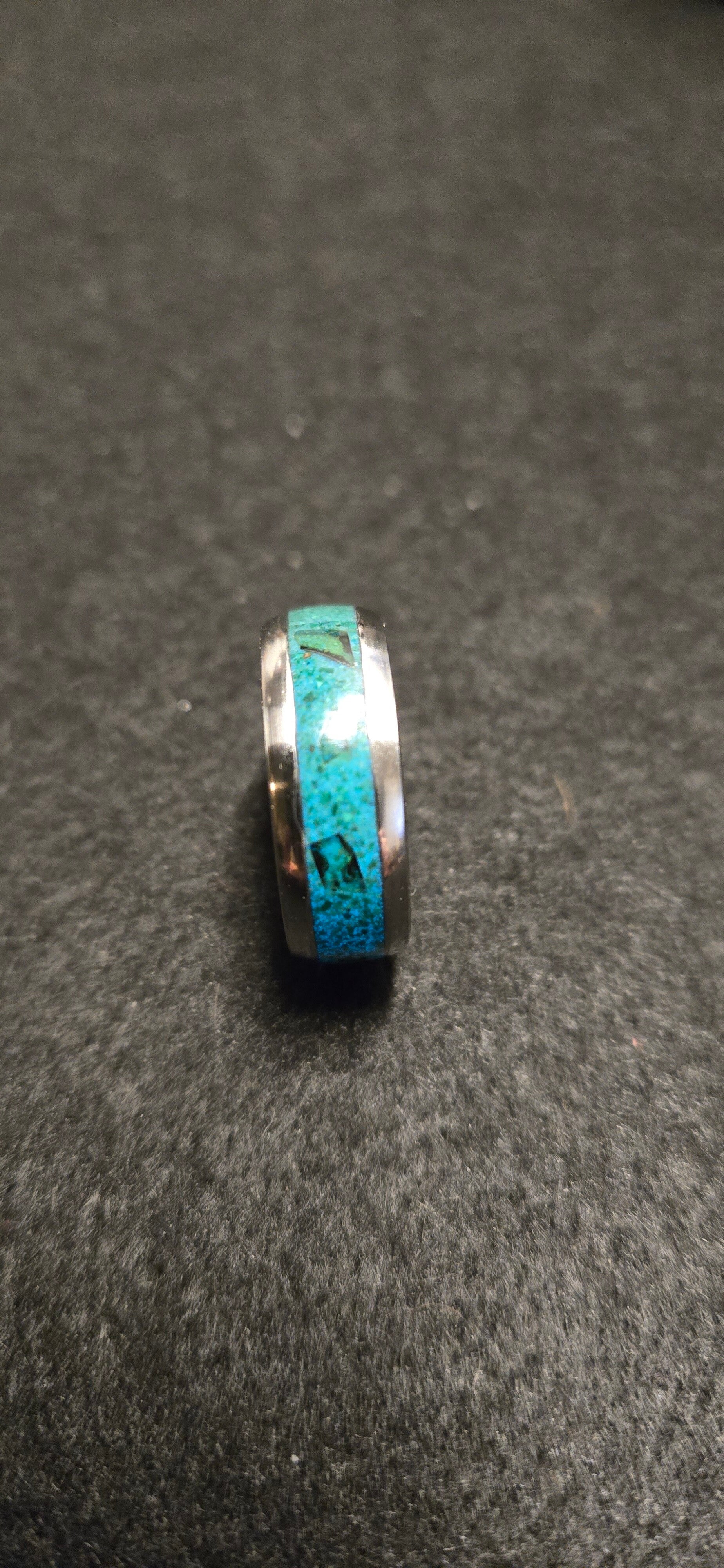 Size 10. comfort fit. this one is nice. Malachite, glow powder and green obsidian flake. reen by day. glow blue at night.